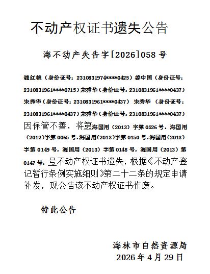 魏红艳 姜中国等6人《不动产权证书》遗失公告第2026058号