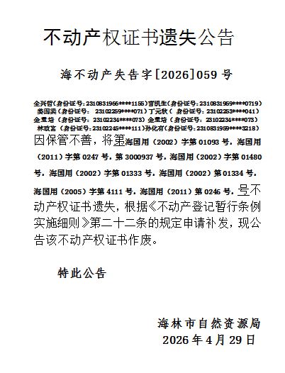 全兴哲 曹凯生等8人《不动产权证书》遗失公告第2026059号
