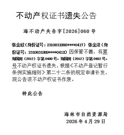 张金欣 张金泽《不动产权证书》遗失公告第2026060号